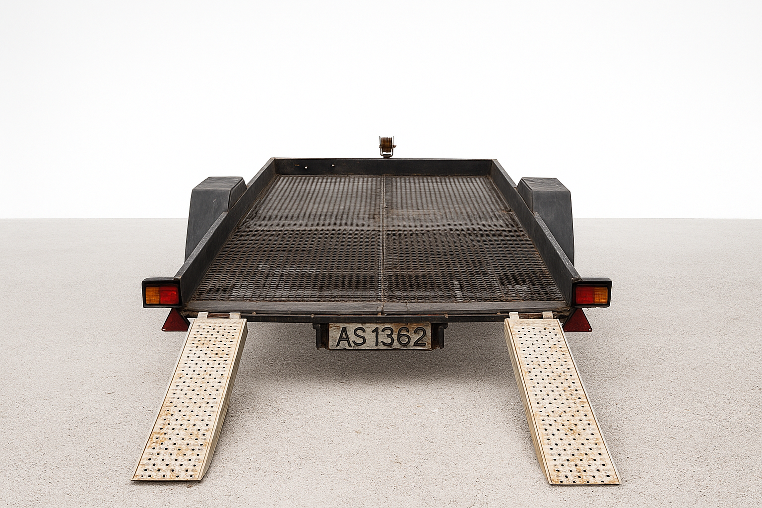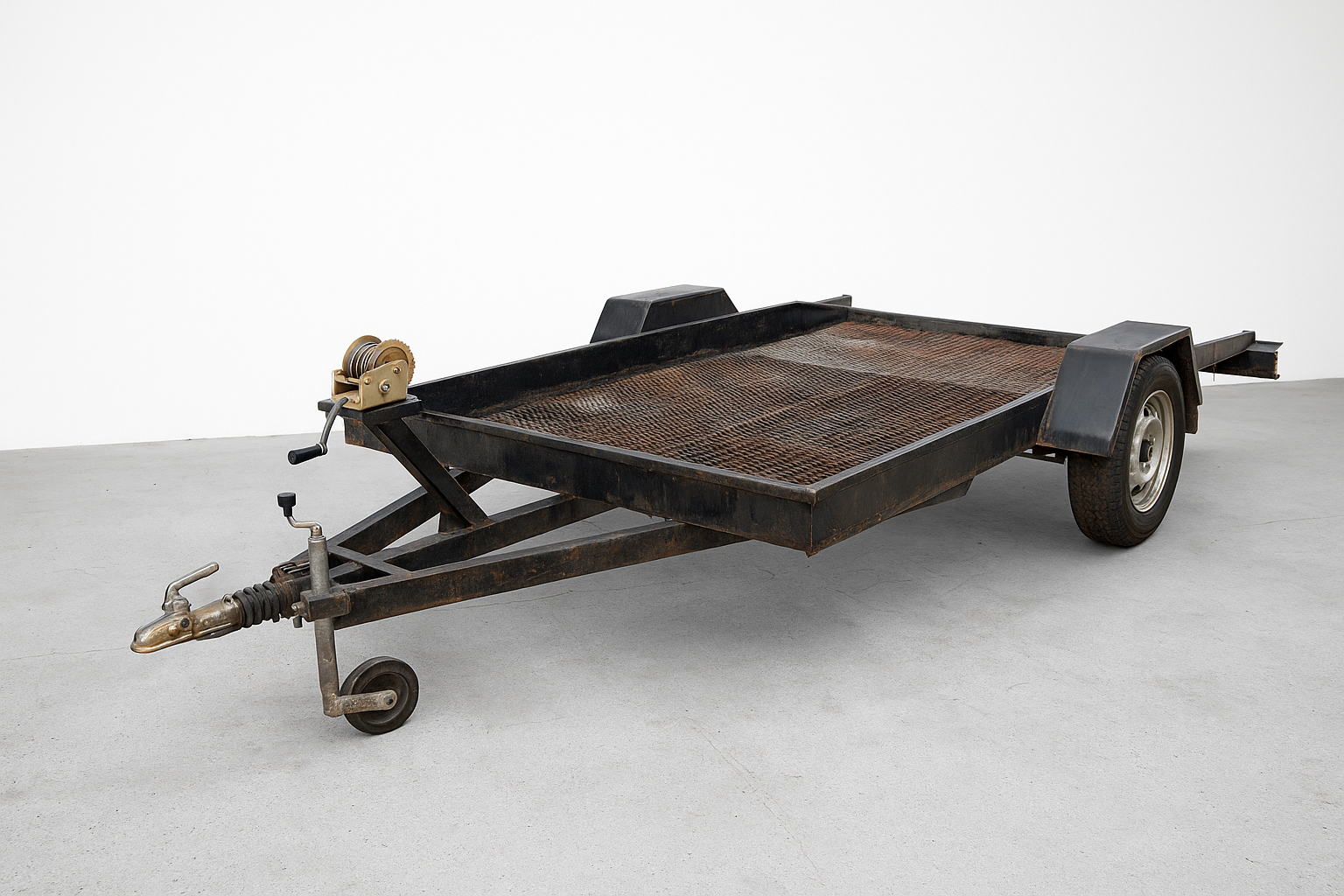Enakslet biltilhenger med håndvinsj og stropper. Kan også brukes til andre formål.
